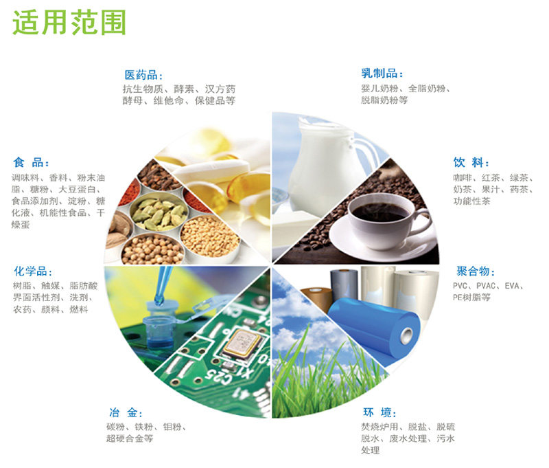 4、由于干燥過(guò)程是在瞬間完成的,產(chǎn)成品的顆粒基本上能保持液滴近似的球狀,產(chǎn)品具有良好的分散性,流動(dòng)性和溶解性;