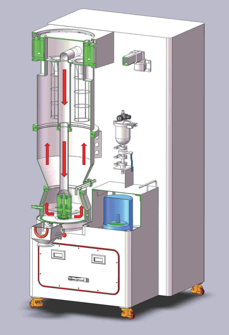 需要打開清理時(shí),過濾排氣段會(huì)提升一段距離,然后再提升沸騰干燥段。這時(shí)沸騰干燥段可以整體向外移出。方便更換過濾器,拆裝刀片等操作。