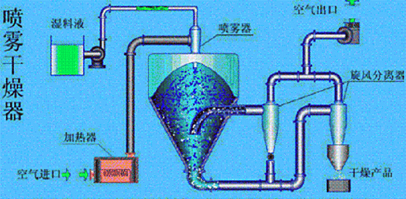 用噴霧干燥器將稀料液(如含水量在75%-85%以上的溶液)噴成霧滴分散于熱氣流中,使水分迅速蒸發(fā)而得到固體產(chǎn)品,干燥時間一般僅需數(shù)秒到數(shù)十秒。噴霧器是噴霧干燥的關(guān)鍵部分,主要離心式,壓力式及氣流式噴霧器。