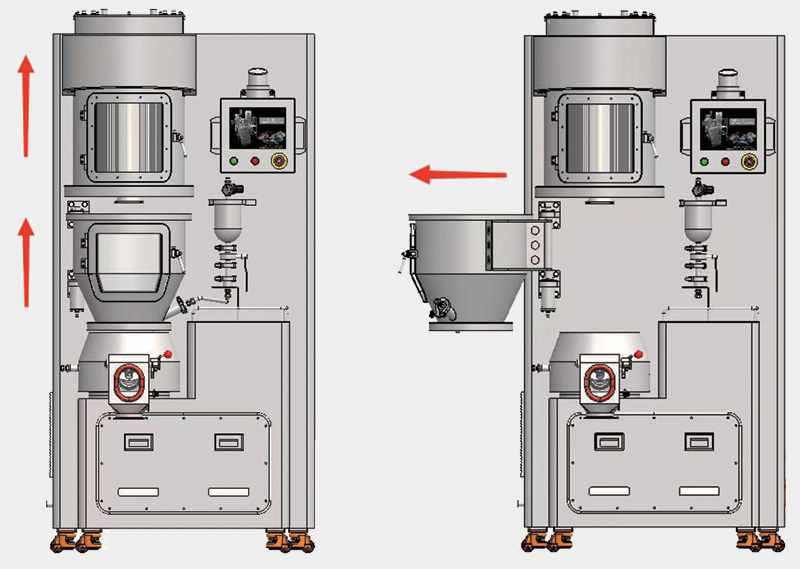 需要打開清理時(shí),過濾排氣段會(huì)提升一段距離,然后再提升沸騰干燥段。這時(shí)沸騰干燥段可以整體向外移出。方便更換過濾器,拆裝刀片等操作。